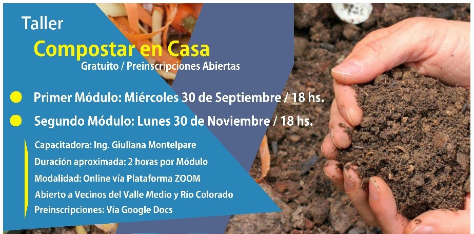 El Ente de Desarrollo Regional del Valle Medio -EnDeVaM- a través del área de Gestión Ambiental Municipal Regional continúa con el ciclo de capacitaciones, es esta ocasión larga las preinscripciones para un Taller denominado "Compostar en Casa" con modalidad online, abierto a todas y todos los vecinos del Valle Medio y Río Colorado de manera gratuita.